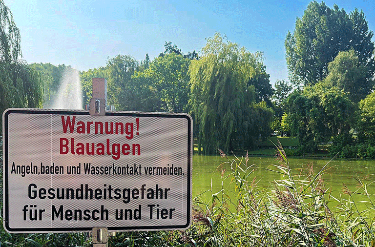Blaualgen sind Bakterien, die sich überall in Gewässern befinden und bei einer normalen Konzentration ungefährlich sind. Gefährlich können sie aber werden, wenn sie sich stark vermehren. Blaualgen produzieren eine Reihe von giftigen Stoffen. Eine Gefahr besteht vor allem durch das Schlucken des Wassers. Blaualgen können bei Menschen zu Übelkeit, Erbrechen, Durchfall, Hautreizungen, geröteten Augen, Fieber und Atemnot führen. Laut Stadtverwaltung treten solche sogenannten Blaualgenblüten vor allem in den Sommermonaten bei hohen Wassertemperaturen auf.