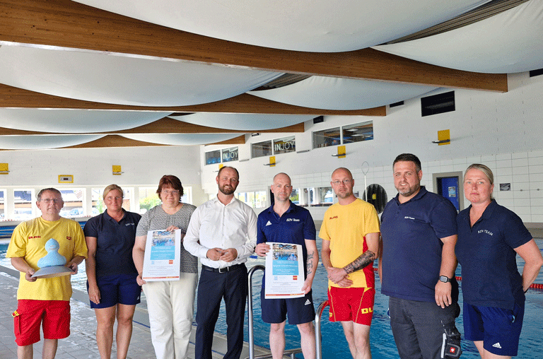 Beitragsbild: Bürgermeister Malte Schneider (4. von links), Badleiterin Frauke Hilal (3. von links) und der Vorsitzende der DLRG-Ortsgruppe Schöningen Enno Deuter (3. von rechts) freuen sich mit dem Organisationsteam auf das dritte 12-Stunden-Schwimmen. Foto: Anke Grundmann
