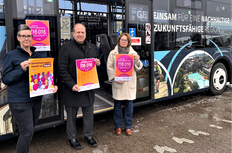 Unter dem Motto „Gemeinsam gegen Gewalt an Frauen“ wollen Landkreis und KVG mit einer breit angelegten Öffentlichkeitsaktion ein deutliches Signal setzen. Seit dem 20. November hängen in zahlreichen Bussen gut sichtbare Plakate, die auf das Hilfetelefon aufmerksam machen. Rund drei Wochen lang sollen sie täglich Tausende Menschen erreichen. Zusätzlich plant die KVG begleitende Beiträge in ihren sozialen Medien, um das Thema in die digitale Öffentlichkeit zu tragen.