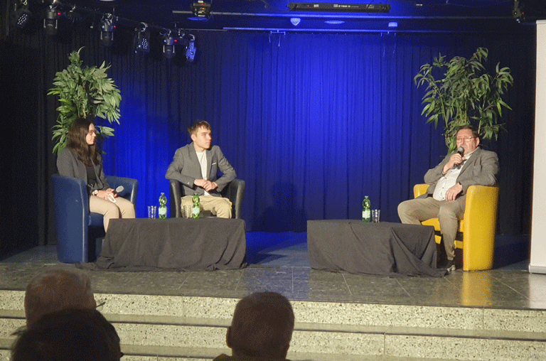Beitragsbild: Die Schüler Mia Weitze und Maximilian Hille moderierten das Gespräch mit dem Palliativmediziner Jürgen Sopora. Foto: GAS Schöningen