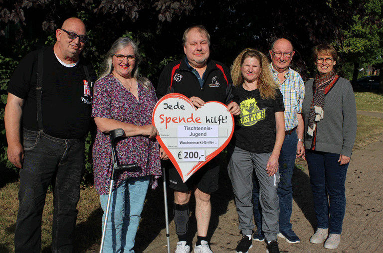 Die ehrenamtlich agierenden Wochenmarkt-Griller aus Schöppenstedt haben der Jugend der Tischtennis-Abteilung des TSV Schöppenstedt eine Spende übergeben.